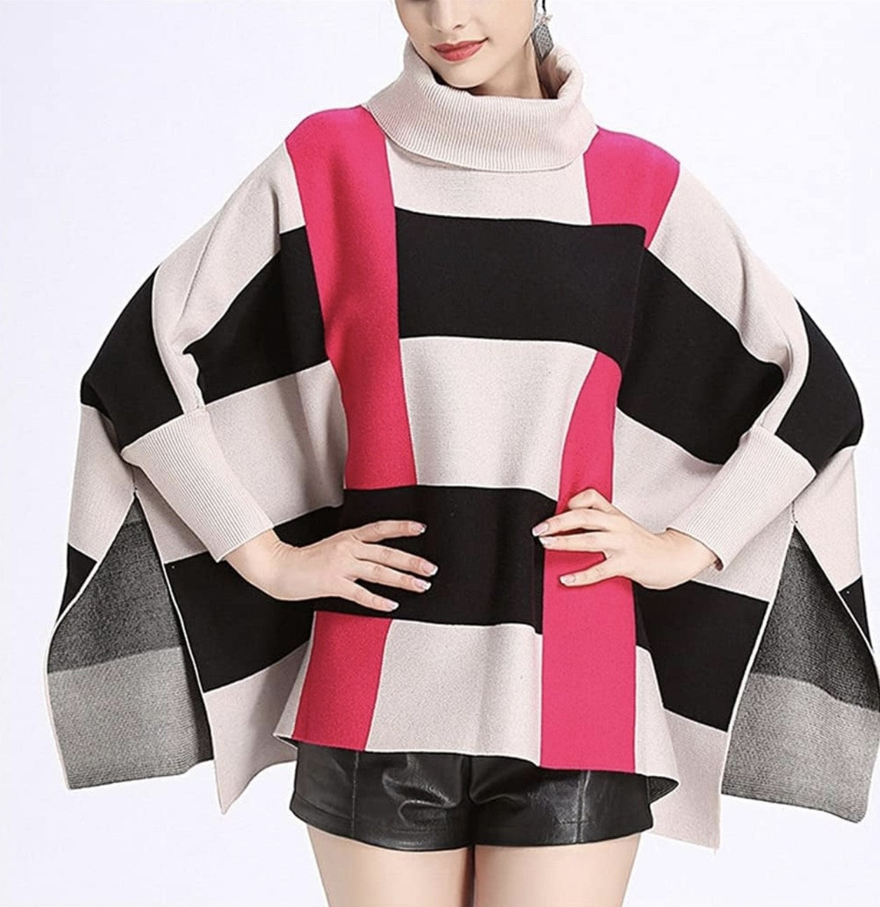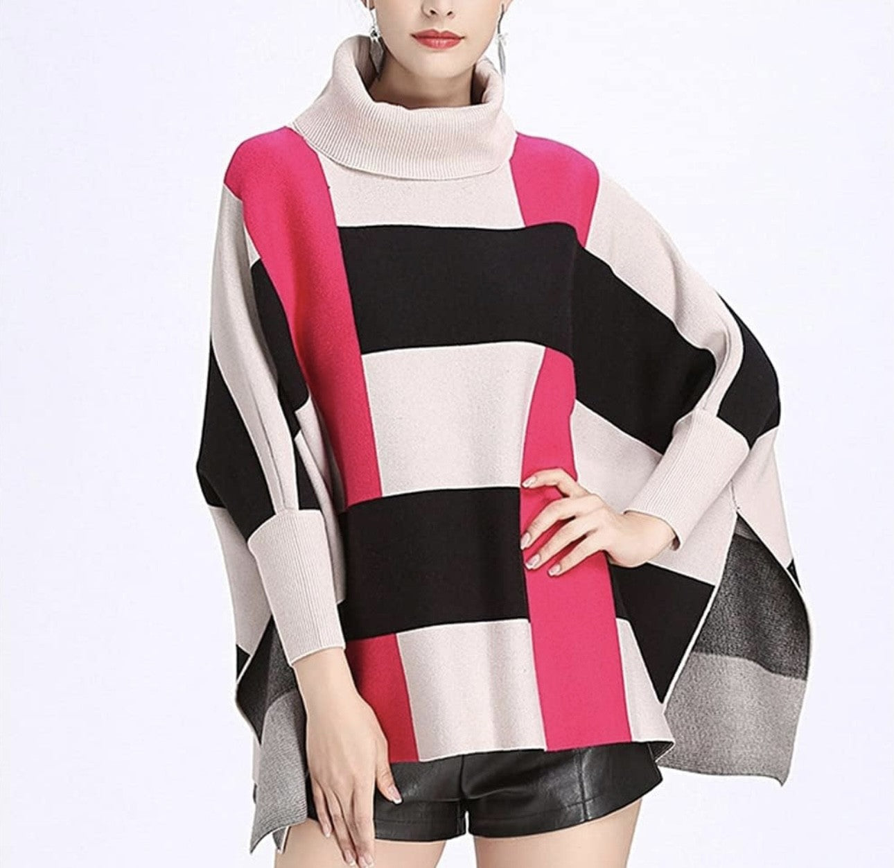 Looking for a stylish and versatile addition to your wardrobe? Look no further than our COLOUR BLOCK OVERSIZED PONCHO! This poncho is the ultimate statement piece, featuring a roll neck design, oversized fit, and 3/4 batwing sleeves. Made from a high-quality viscose blend, it is not only comfortable but also luxurious to the touch.