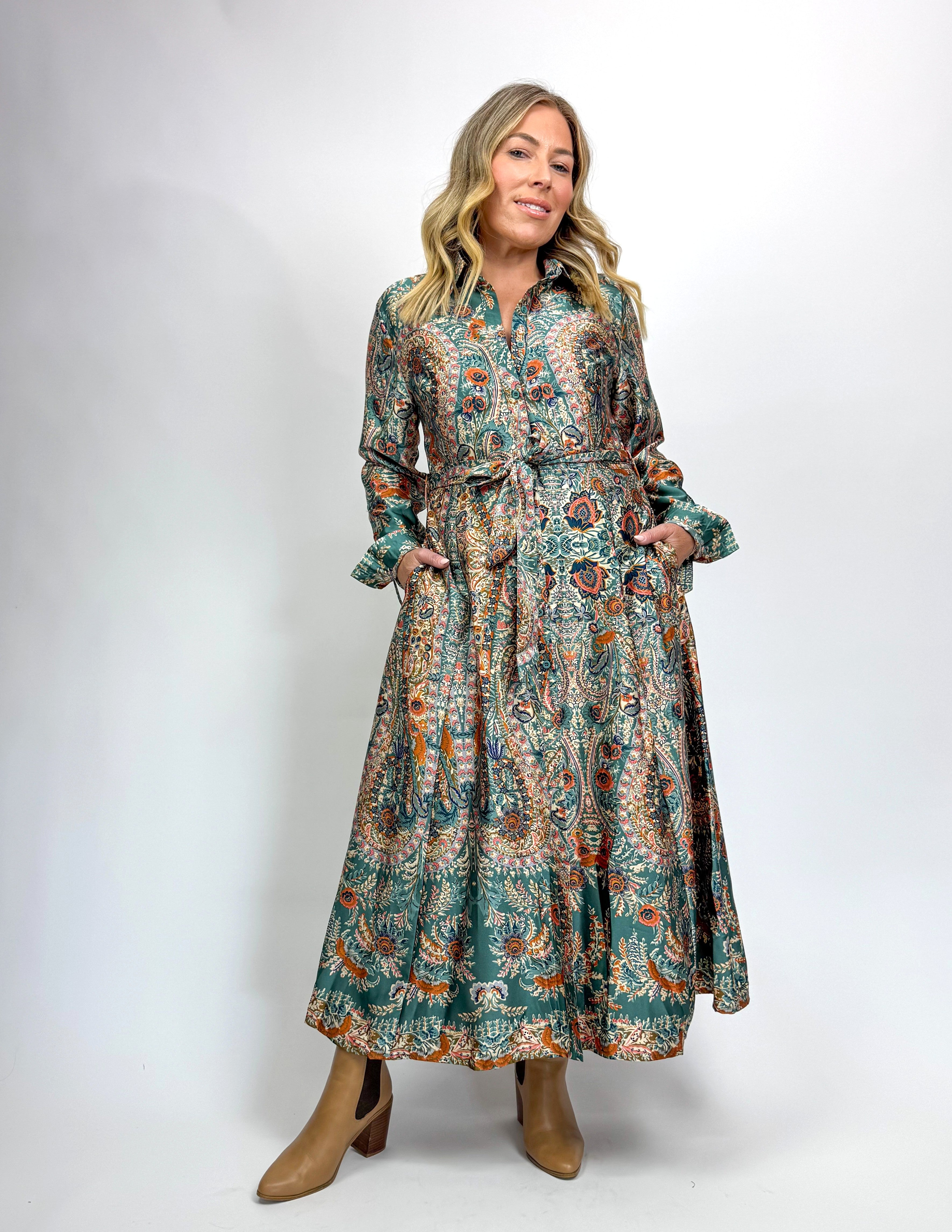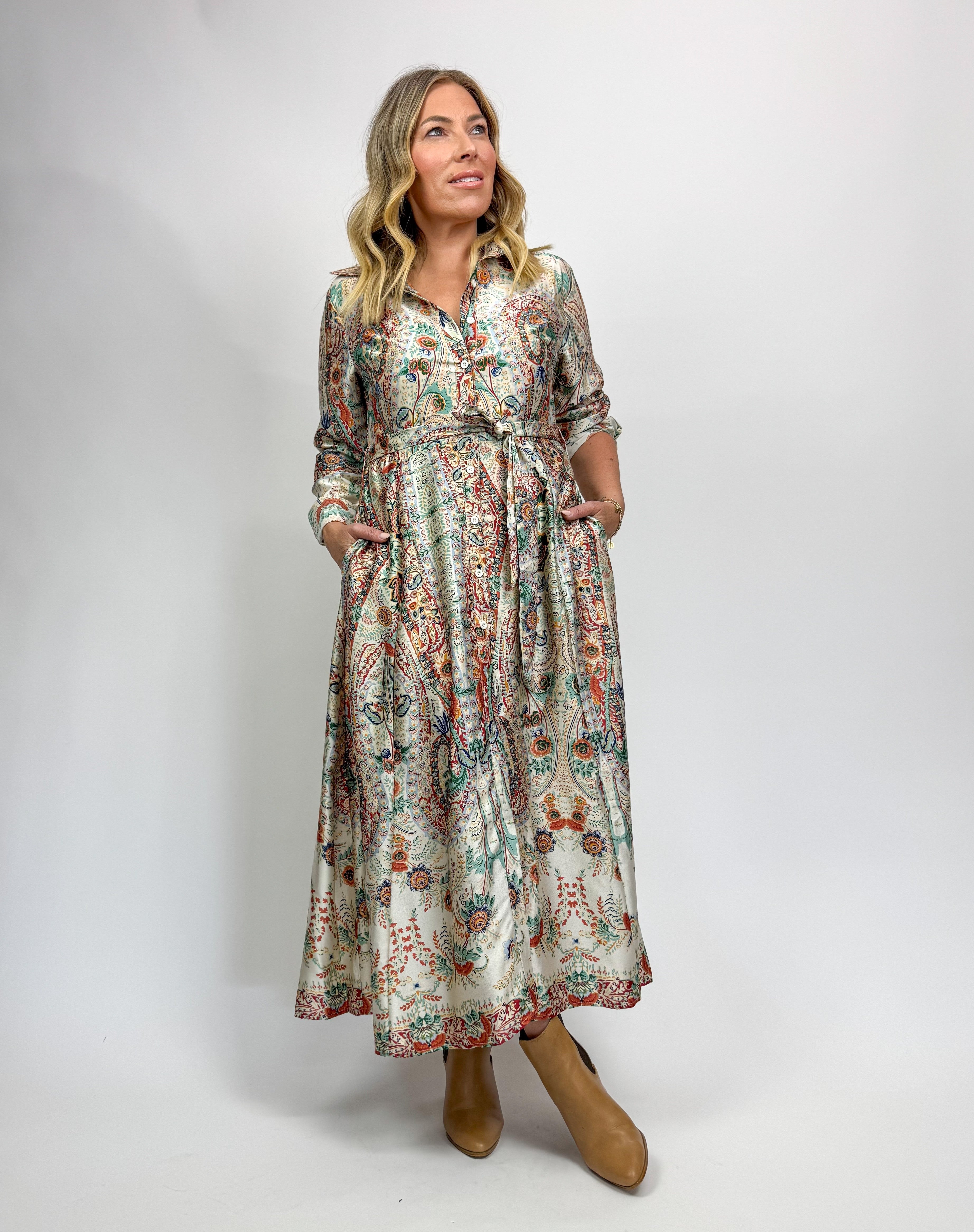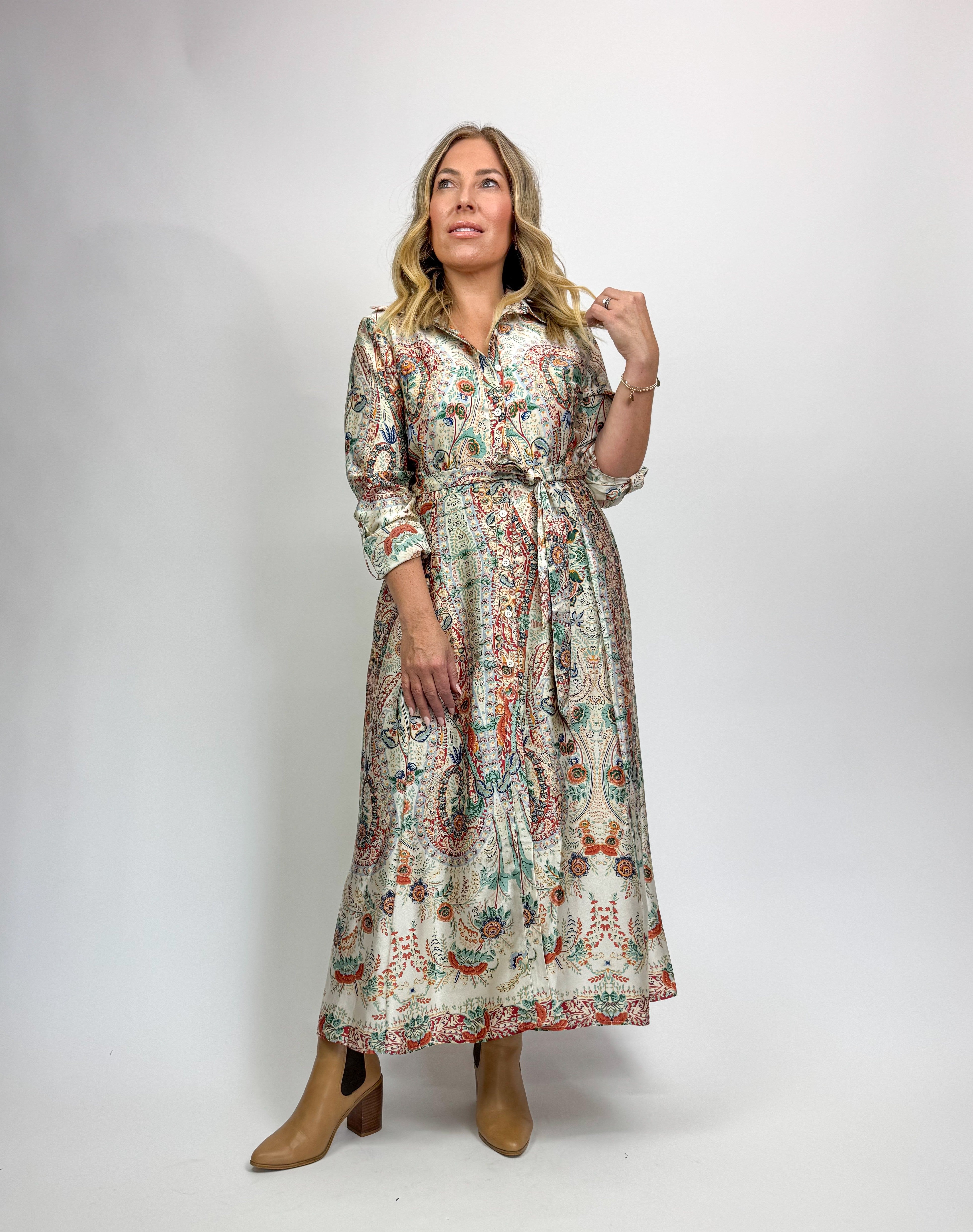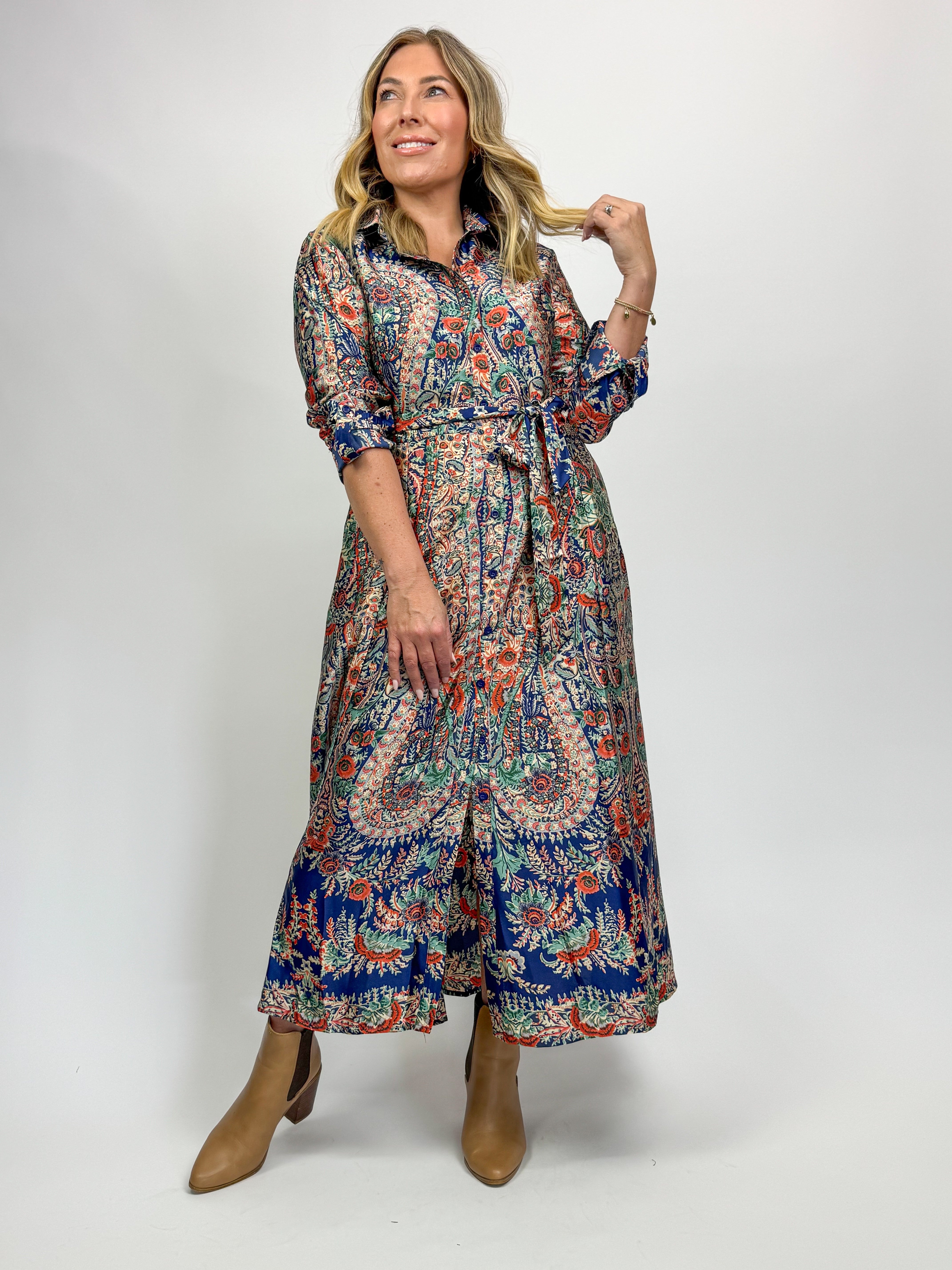 The versatile shirt dress design of this garment makes it a perfect choice for any occasion. Whether you're heading to a formal event or a casual outing with friends, the Paisley Shirt Dress has got you covered. The classic shirt collar and button-down front give it a professional yet chic look, perfect for a day at the office. And when it's time to let your hair down, simply unbutton a few buttons and tie the belt at the waist for a more relaxed and flirty vibe.
