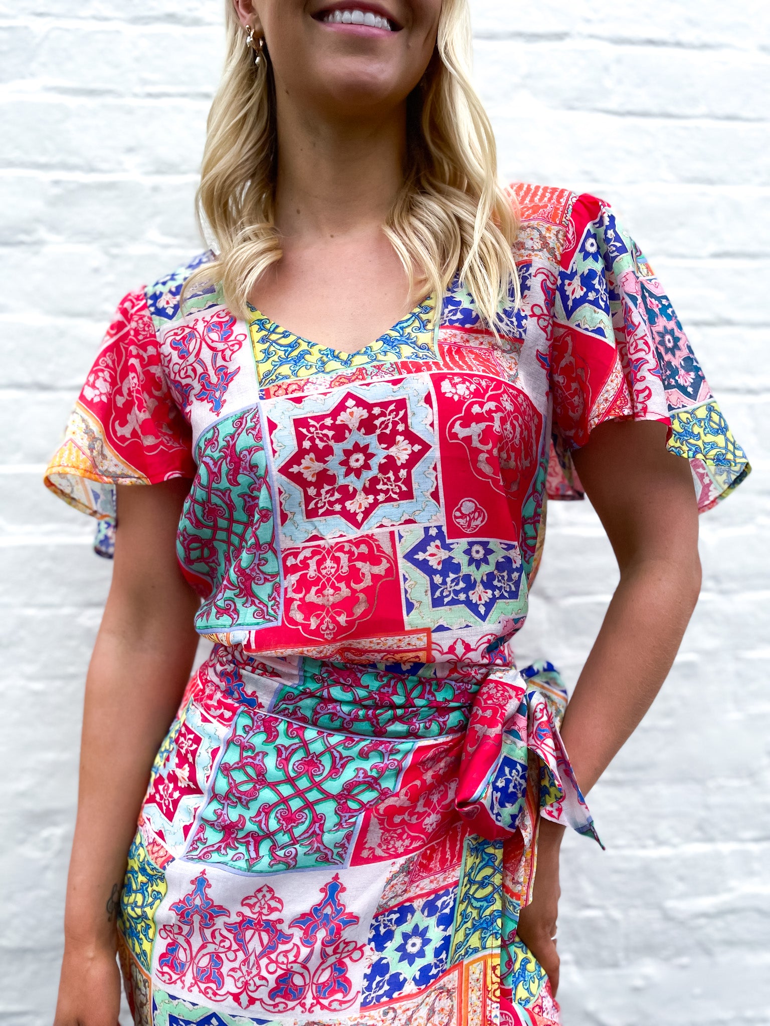 Are you ready to turn heads and make a statement? Look no further than the ARABASQUE PATCHWORK TOP! This stunning top features a unique, eye-catching design that combines the classic elegance of Arabesque patterns with a modern patchwork twist. The FLUTE SHORT SLEEVE adds a touch of femininity and charm, while the V-NECKLINE elongates and flatters your neckline.