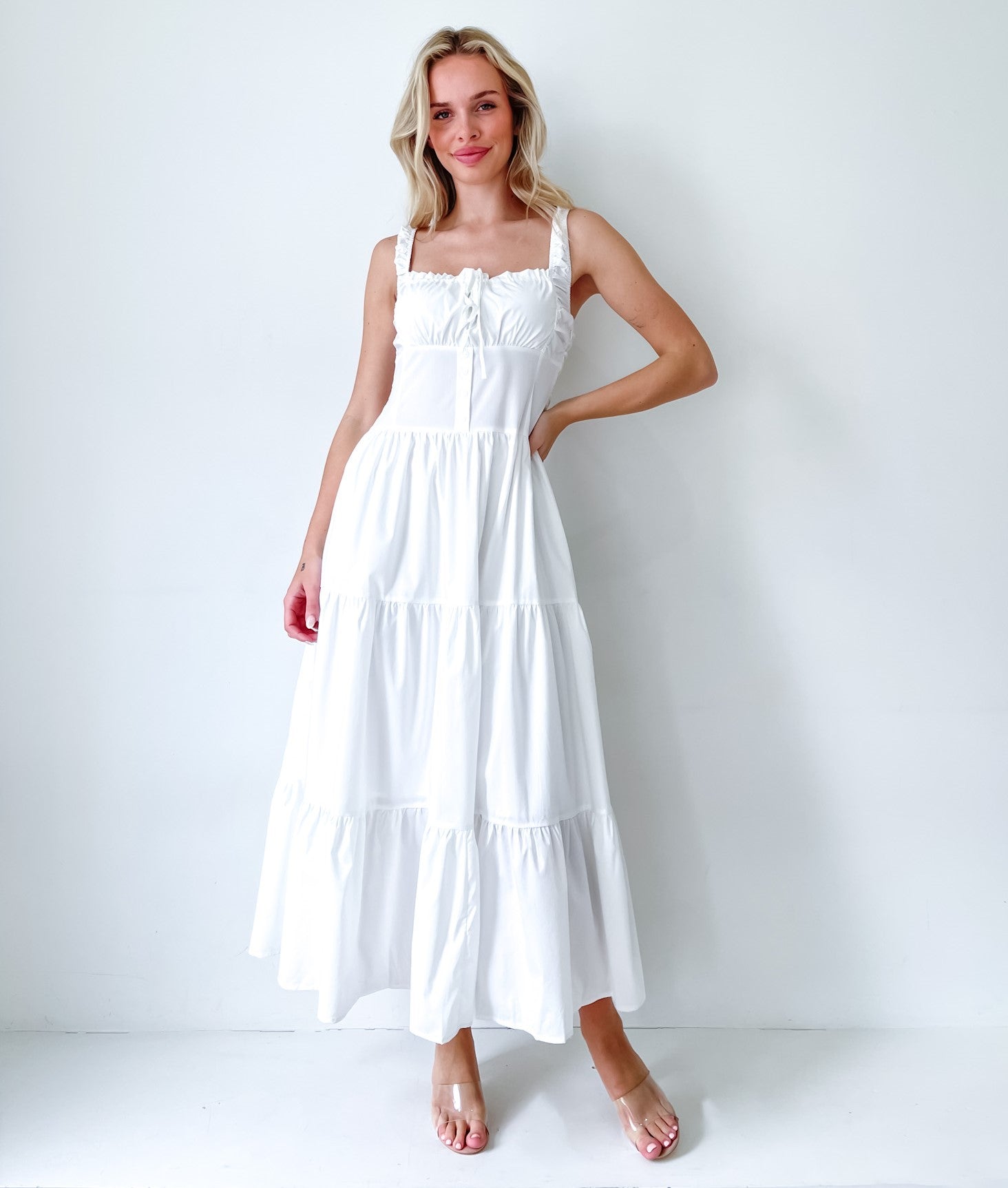 Crafted from the finest cotton, the CHLOE COTTON MAXI DRESS features alluring gathered details that create a flattering silhouette. The intricate corset bust adds a touch of drama and sophistication, making you feel like a true style icon.
