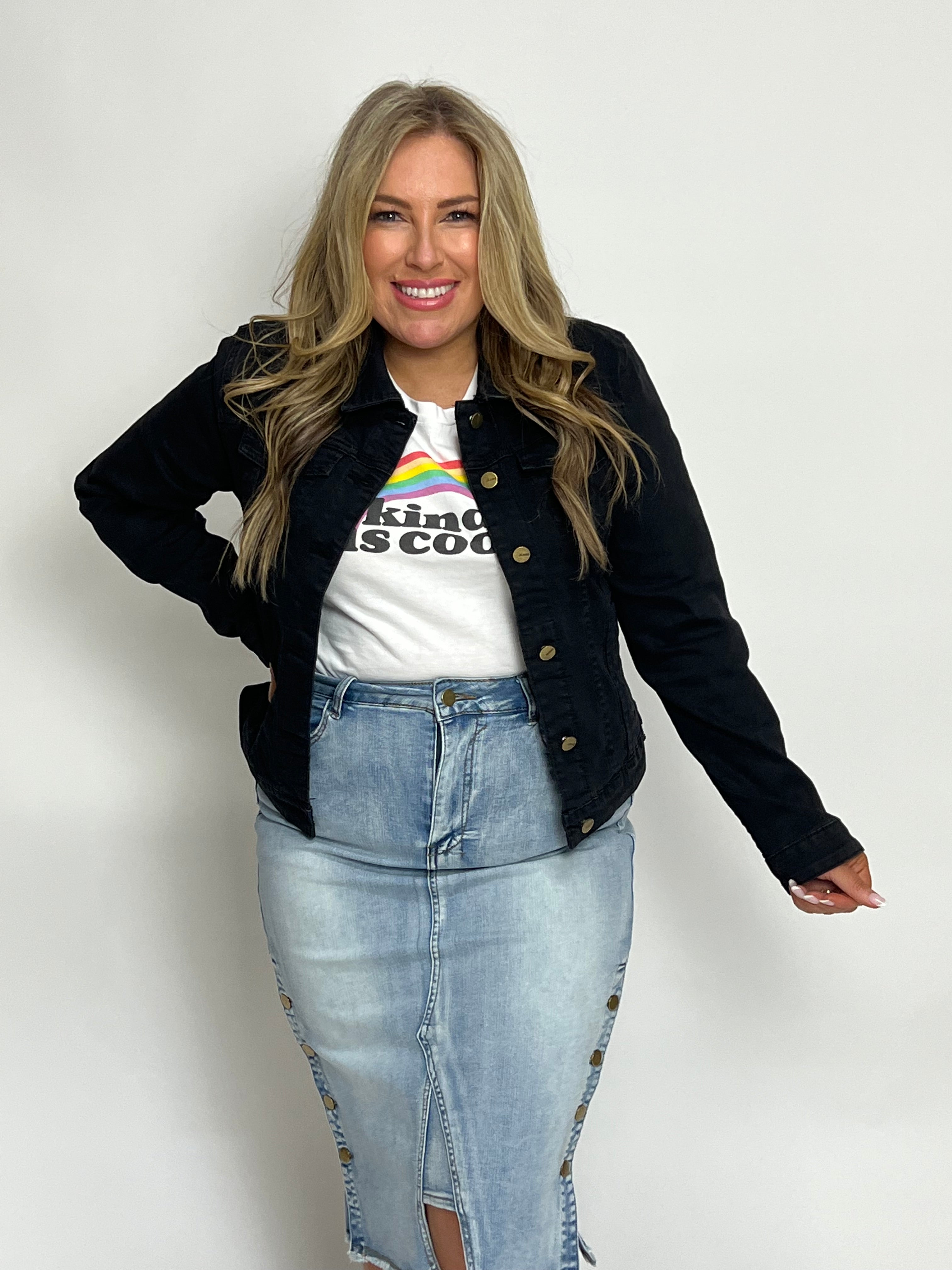 Introducing our classic denim jacket! This wardrobe staple is perfect for any occasion, whether you dress it up or down. The stretch fabric ensures a comfortable fit, while the black colourway goes with everything. Throw it on over a summer dress or your favourite joggers and you're good to go! Such a versatile piece, you'll wonder how you ever lived without it.