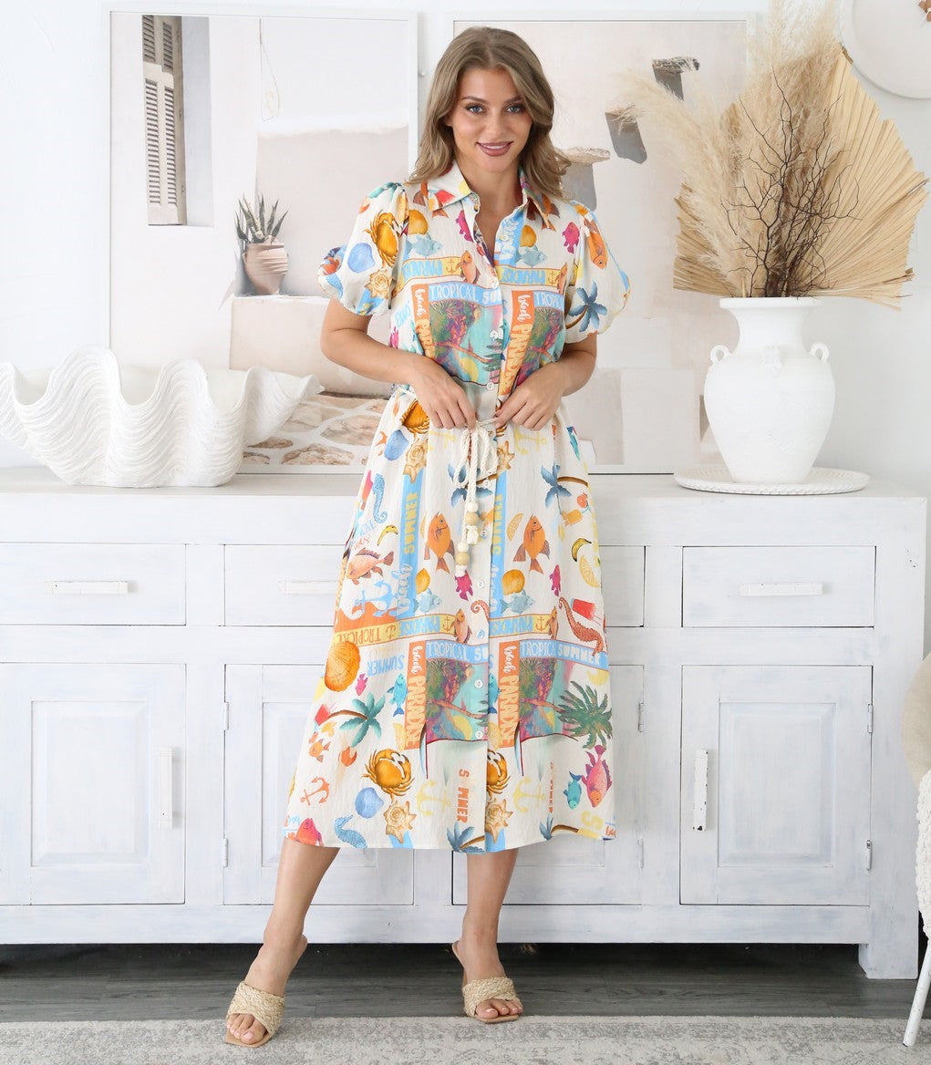 Welcome to the world of PISCES SHIRT DRESS - where style, comfort and creativity come together to make you stand out in the crowd! Our dress is not just any ordinary dress, it's a unique fishy print shirt dress that will capture your heart at first glance.
