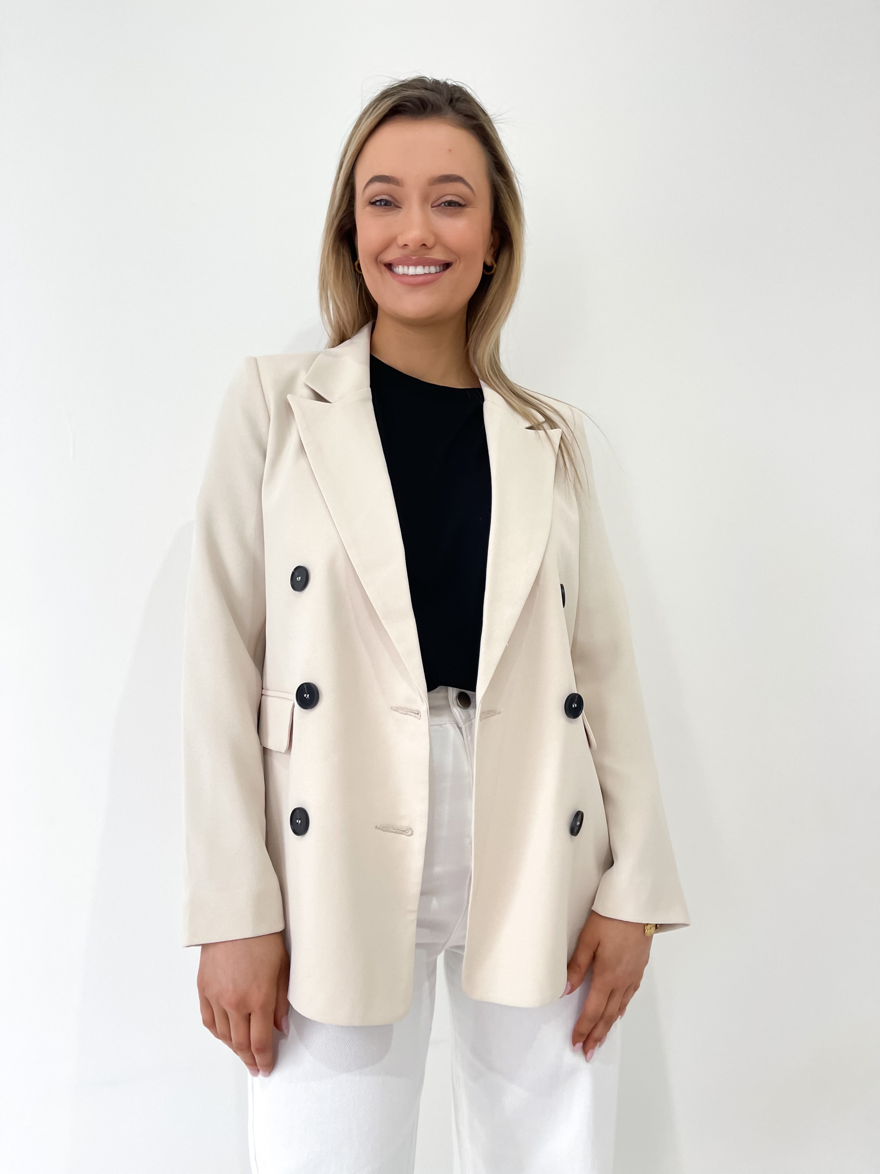 Introducing the SARAH DB BLAZER – the ultimate power piece for the modern woman. With its elegant double breasted design and fully lined interior, this blazer exudes sophistication and class. It is the perfect addition to your professional wardrobe, giving you a subtle yet commanding presence in any corporate setting.