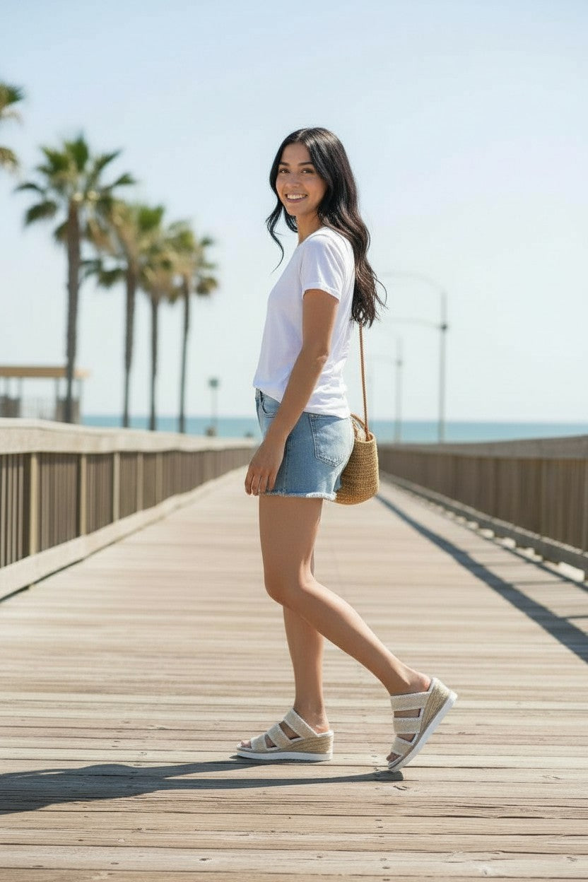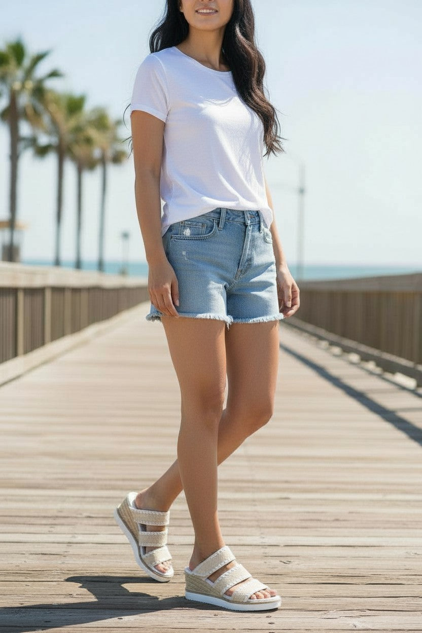 Set atop a lightweight wedge heel wrapped in natural jute for a subtle espadrille-inspired touch, the sandal includes a sporty white platform outsole with a contrast tan midsole accent—adding height without sacrificing stability. Perfect for pairing with summer dresses, cropped jeans, or beach-ready outfits, this sandal brings a touch of bohemian elegance to your warm-weather wardrobe. Ideal for weekend getaways, brunches, or casual strolls under the sun.