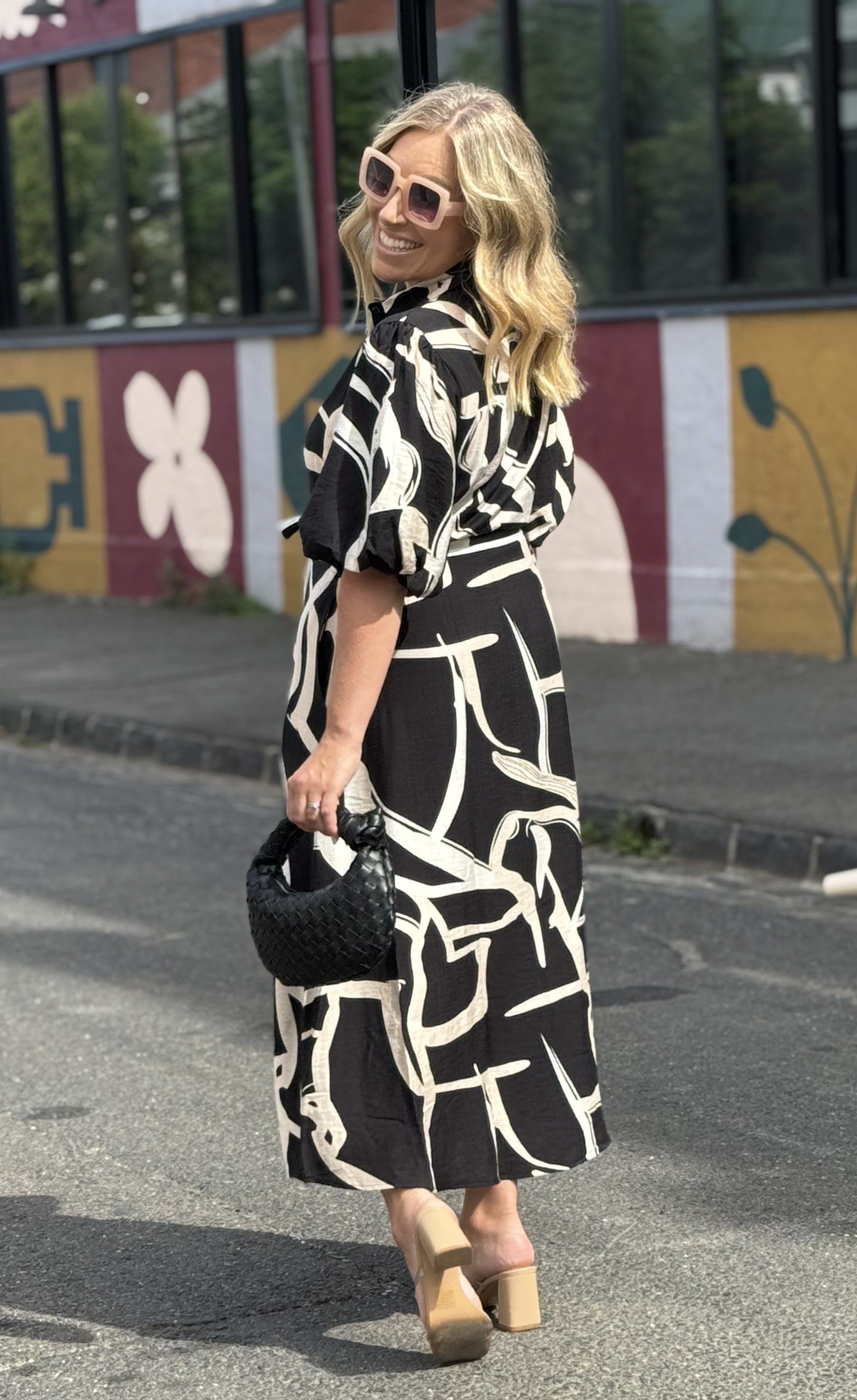 Introducing the Rory Trim Midi Dress, the perfect fusion of sophistication and playfulness. This unique shirt dress features an eye-catching mono print that is sure to turn heads. The beautiful and intricate pattern is a display of modern artistry, making this dress a must-have for any fashion-forward woman.